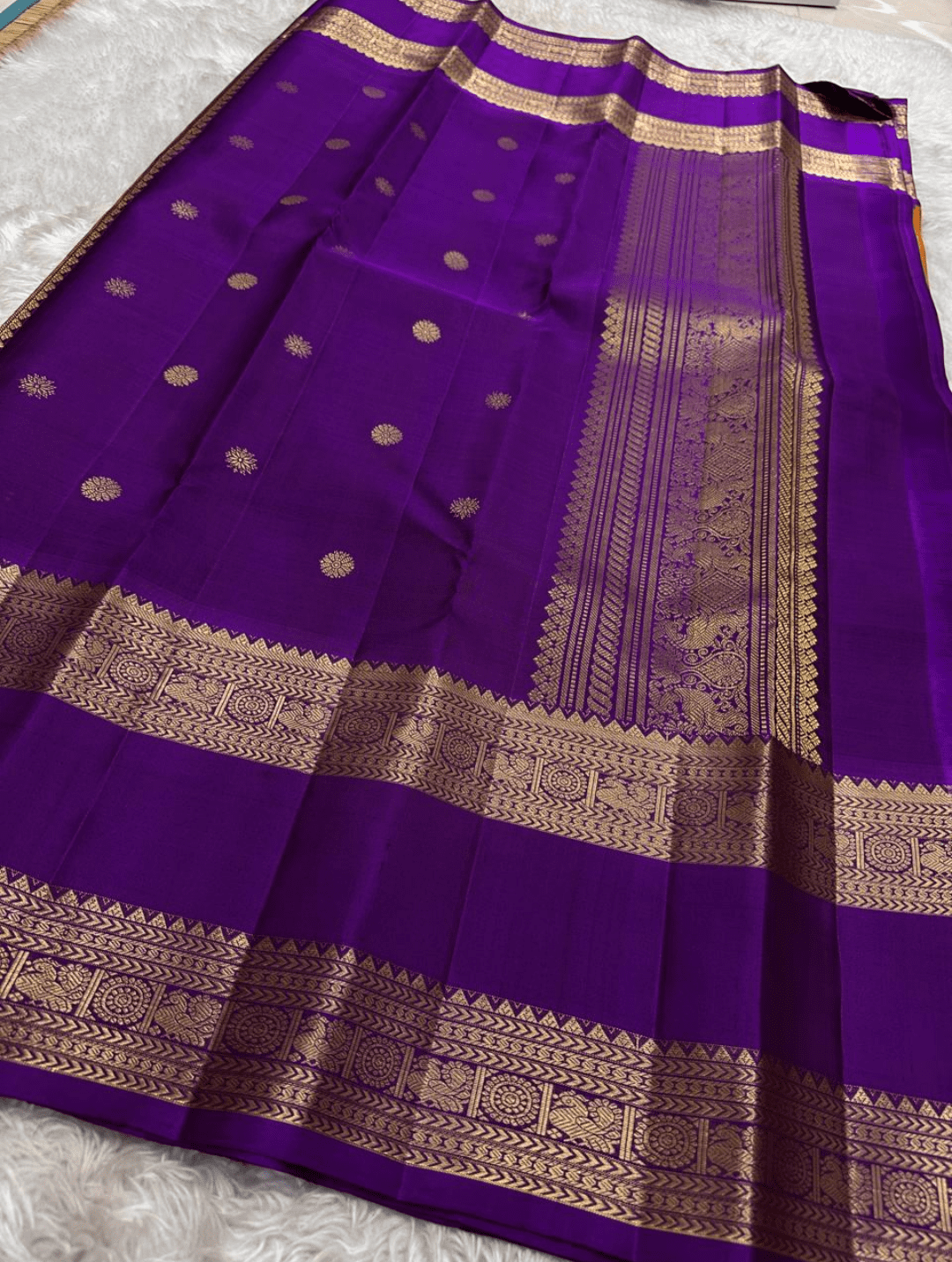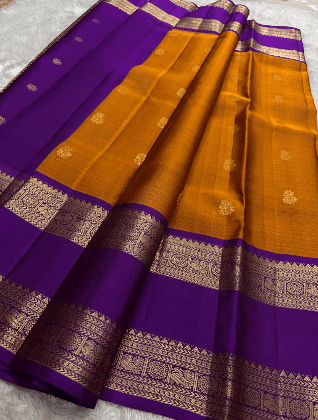 The ‘Tejaswini’ saree, meaning ‘radiant’ or ‘lustrous,’ is a stunning and vibrant piece. Its bright orange body, adorned with subtle golden buttas, is beautifully complemented by a majestic violet border and pallu. The wide, intricate border, woven in rich gold zari, features a classic temple design.