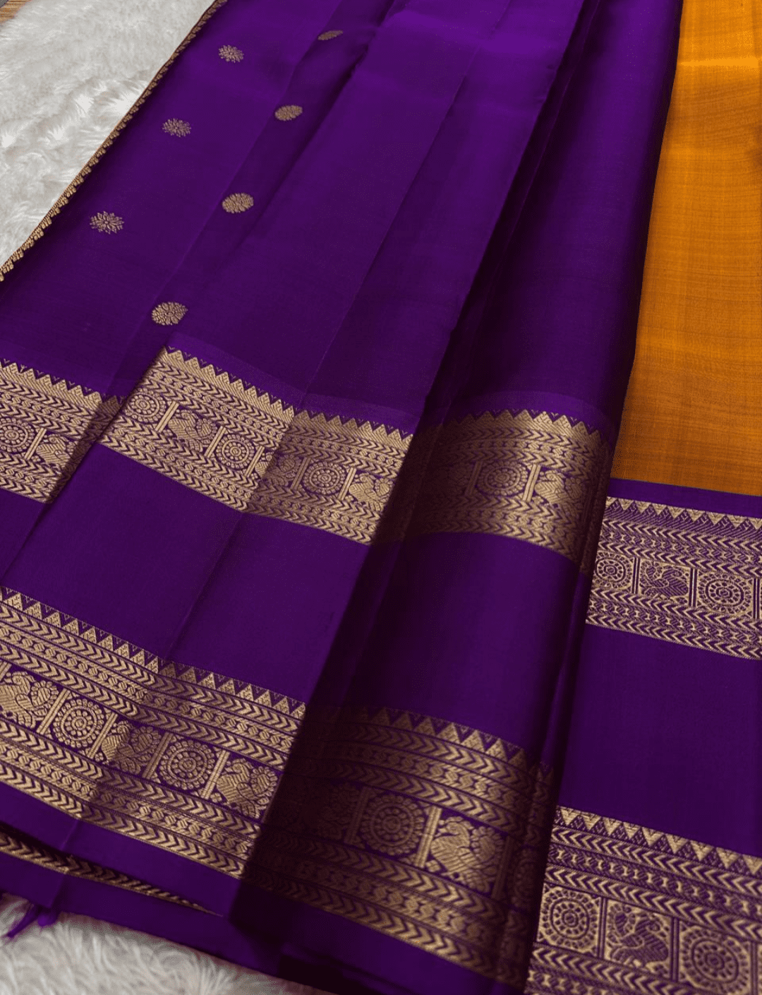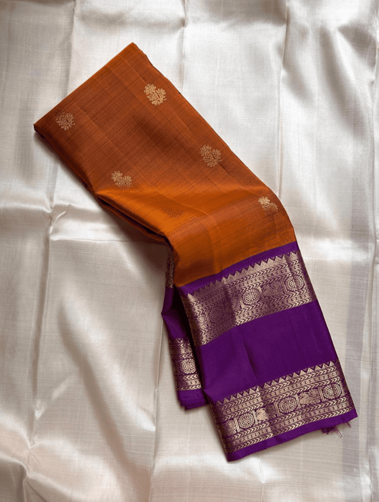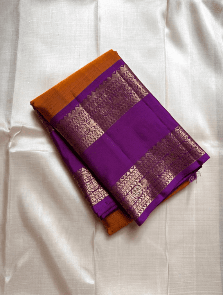 Color: A bright orange body with a contrasting violet pallu and golden border.