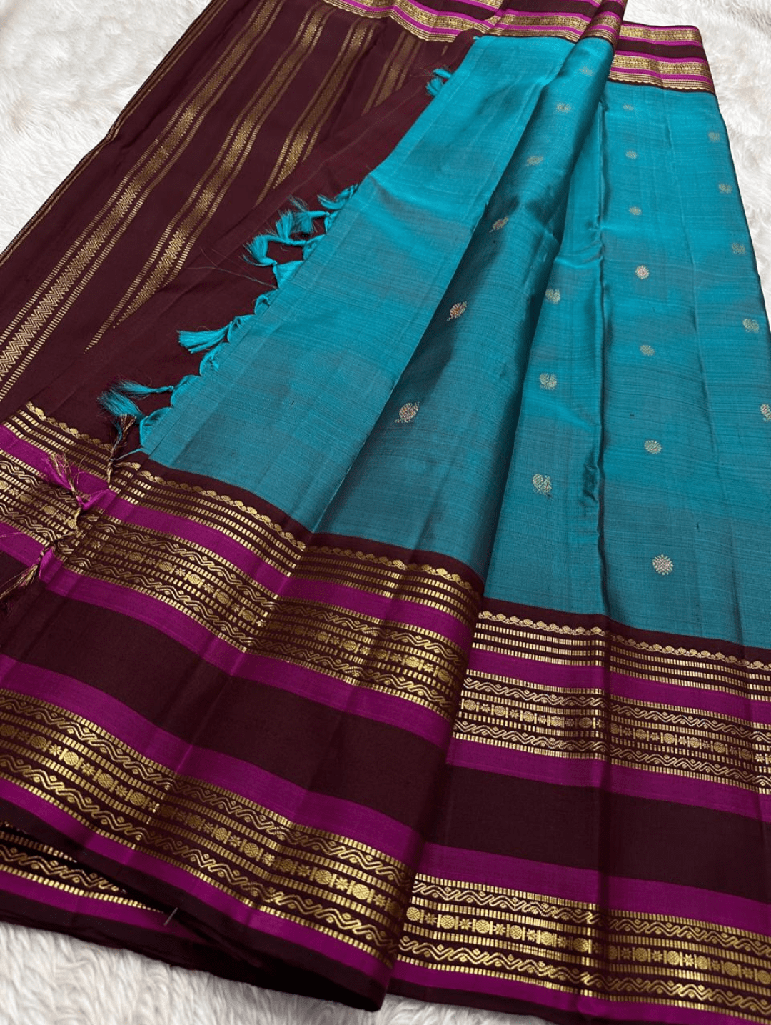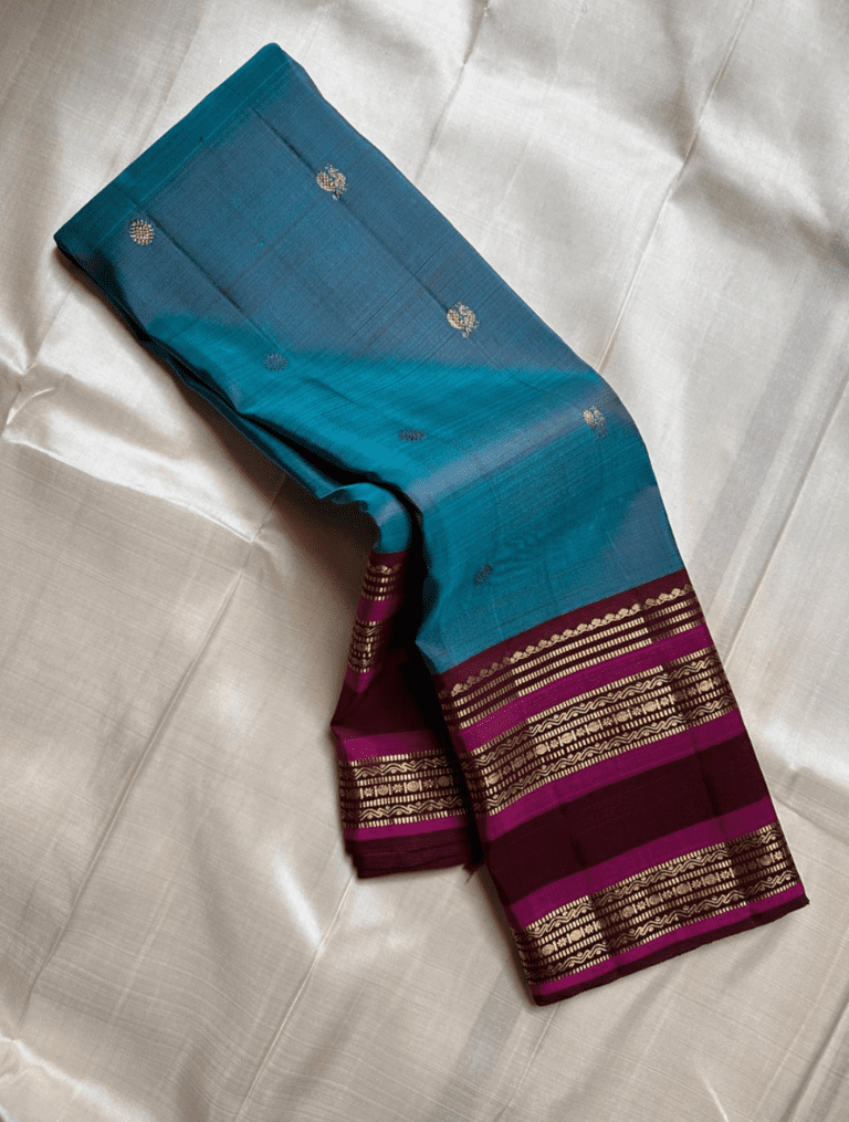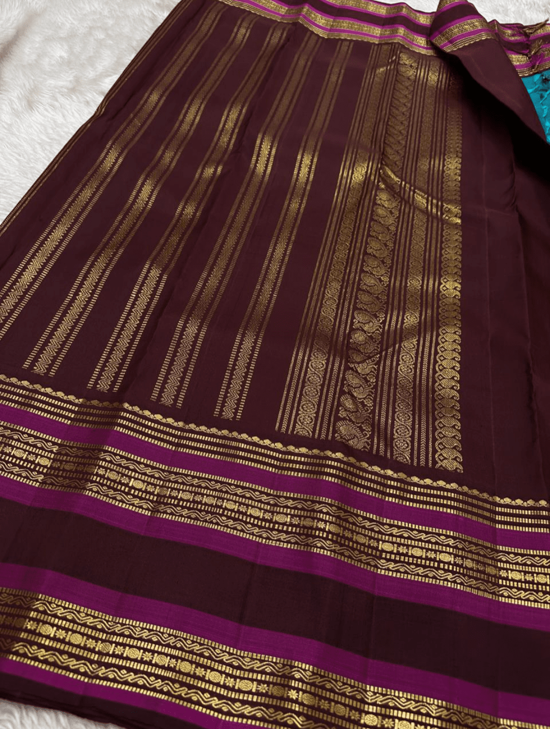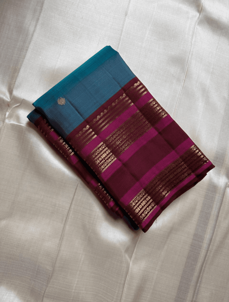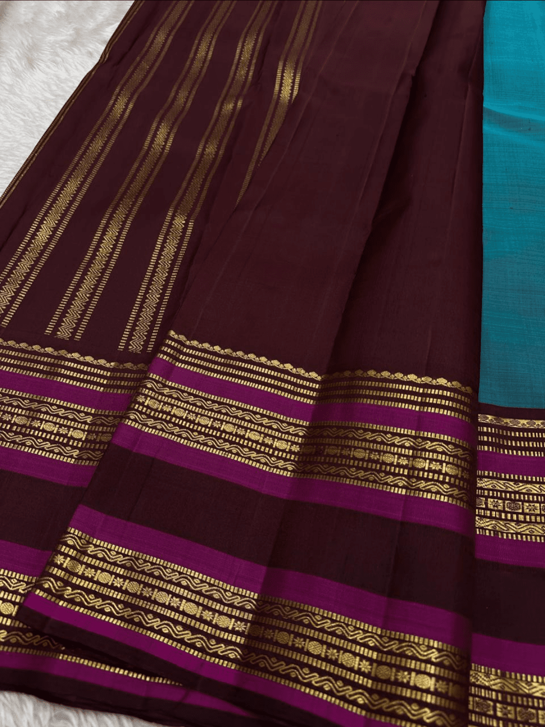 Varuni is a traditional saree that captures the essence of the ocean and the depths of the earth. The body is a profound maroon, a color of deep tradition and strength, adorned with subtle vertical golden lines that shimmer like ripples in the water. This rich hue is beautifully complemented by a serene light blue pallu, symbolizing the calm and cool ocean, and a striking magenta border that represents the vibrant colors of a coastal sunset. The wide border is a showcase of exquisite traditional artistry, featuring classic golden zari patterns that add a touch of timeless elegance. This saree is a perfect blend of natural elements and classic design.