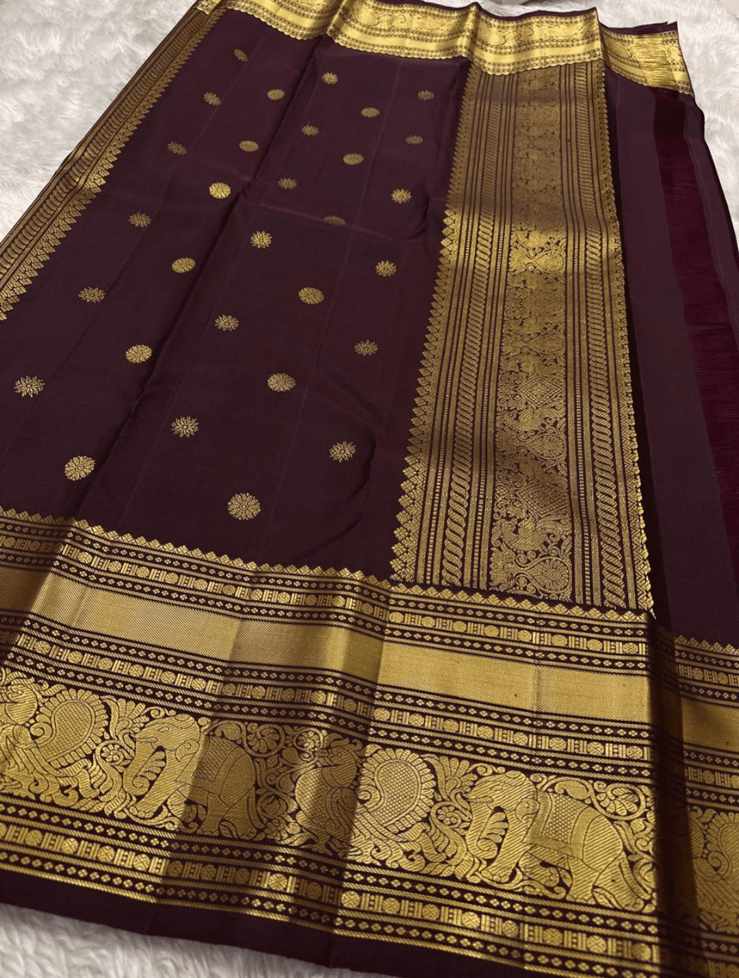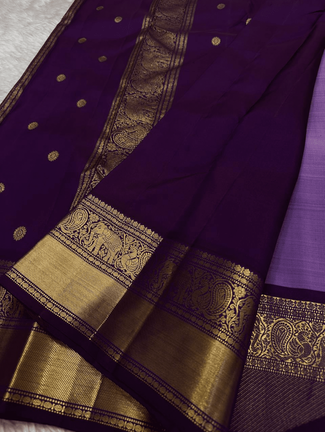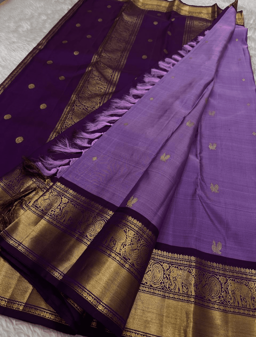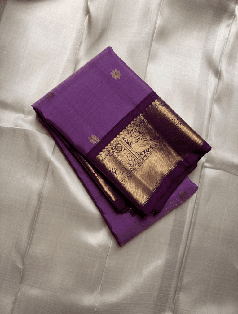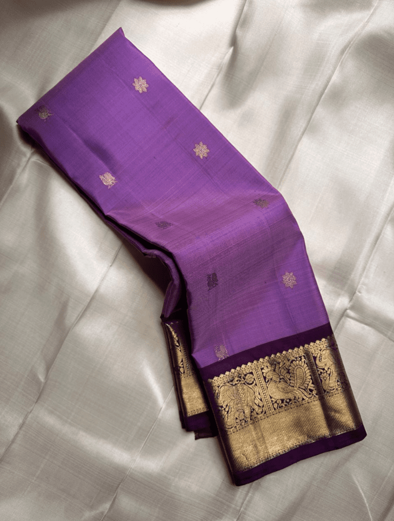 The Vasanthi saree, named after the ‘spring’ season, is a stunning piece that blends elegant colors. Its light lavender body, adorned with subtle golden buttas, creates a soft and graceful look. The rich, dark purple pallu and border with intricate elephant 🐘 and peacock motifs provide a beautiful and classic contrast.