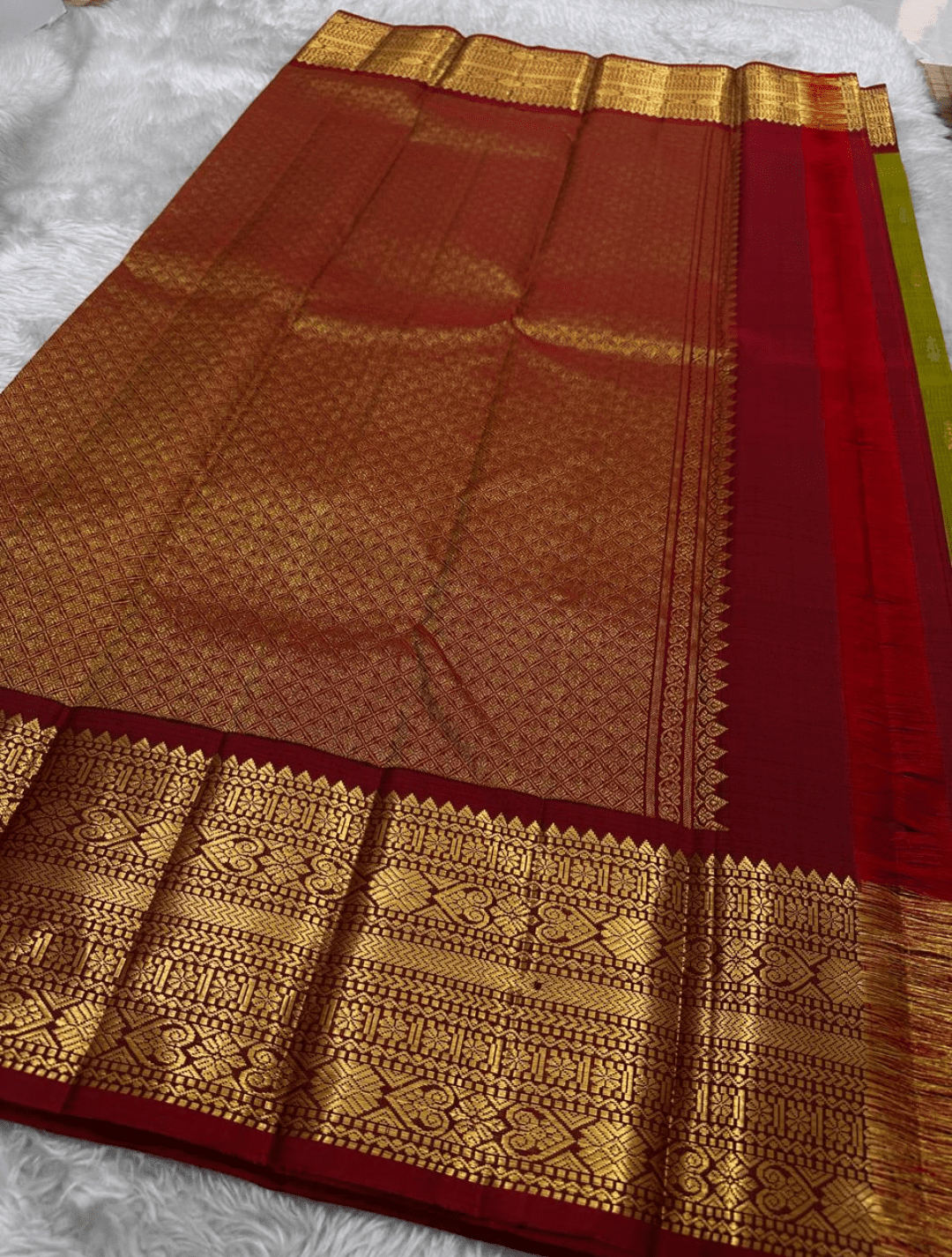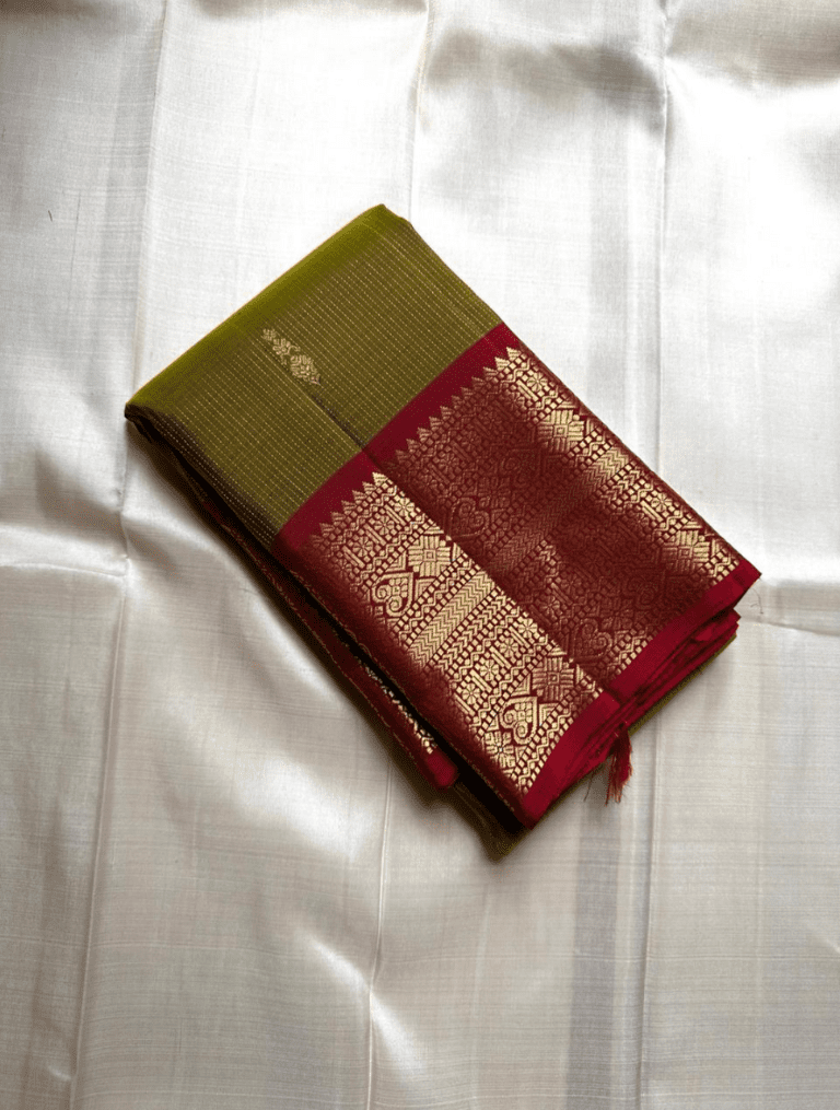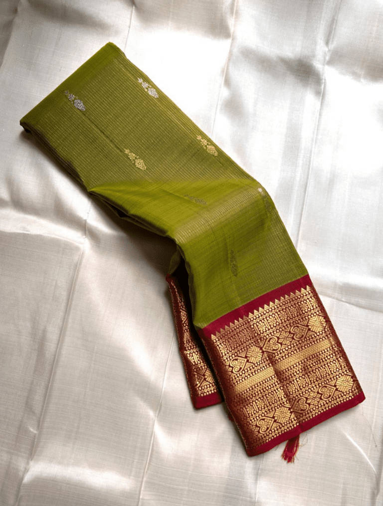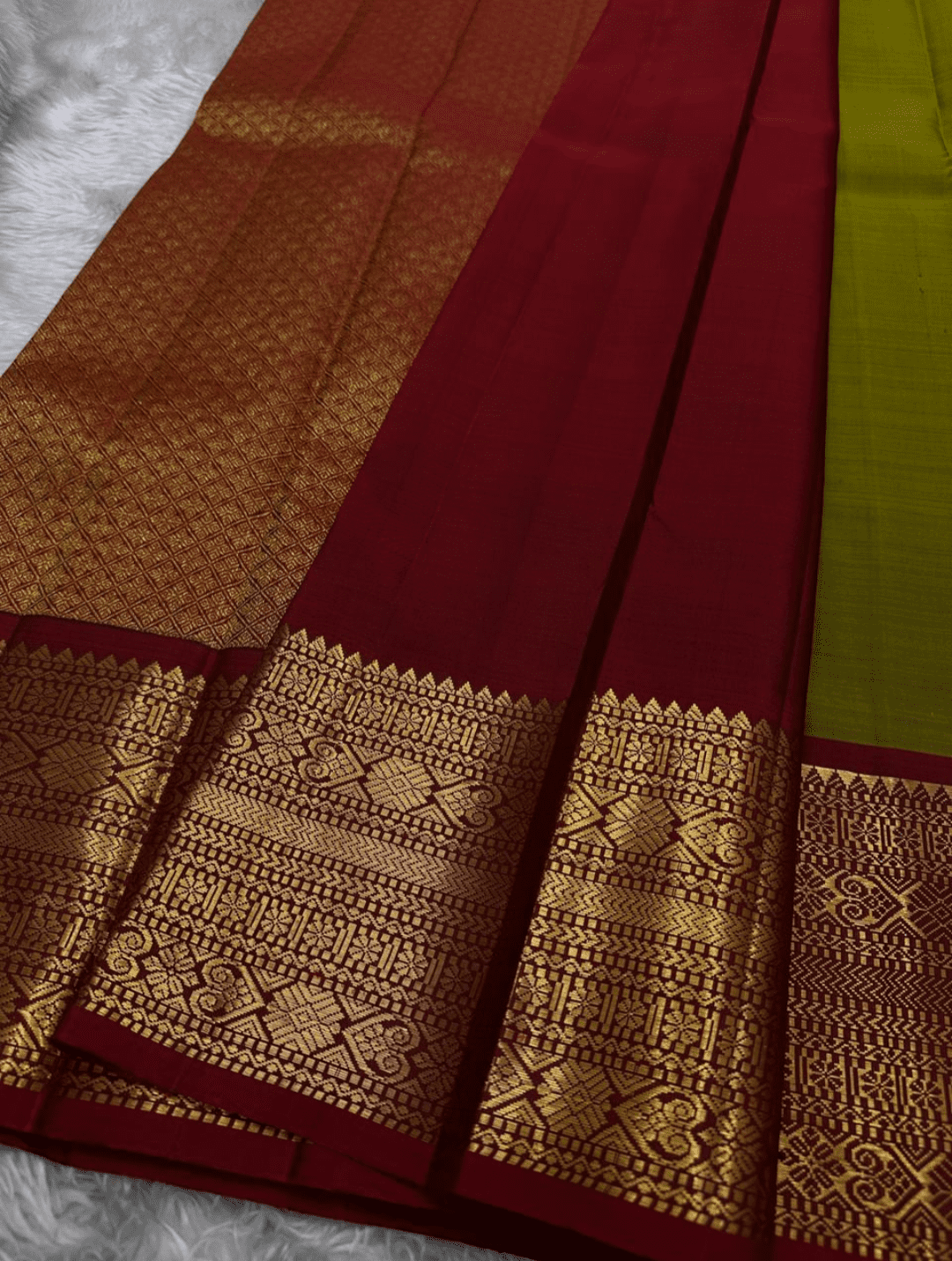 Color: A light green body with a contrasting deep maroon border and pallu.