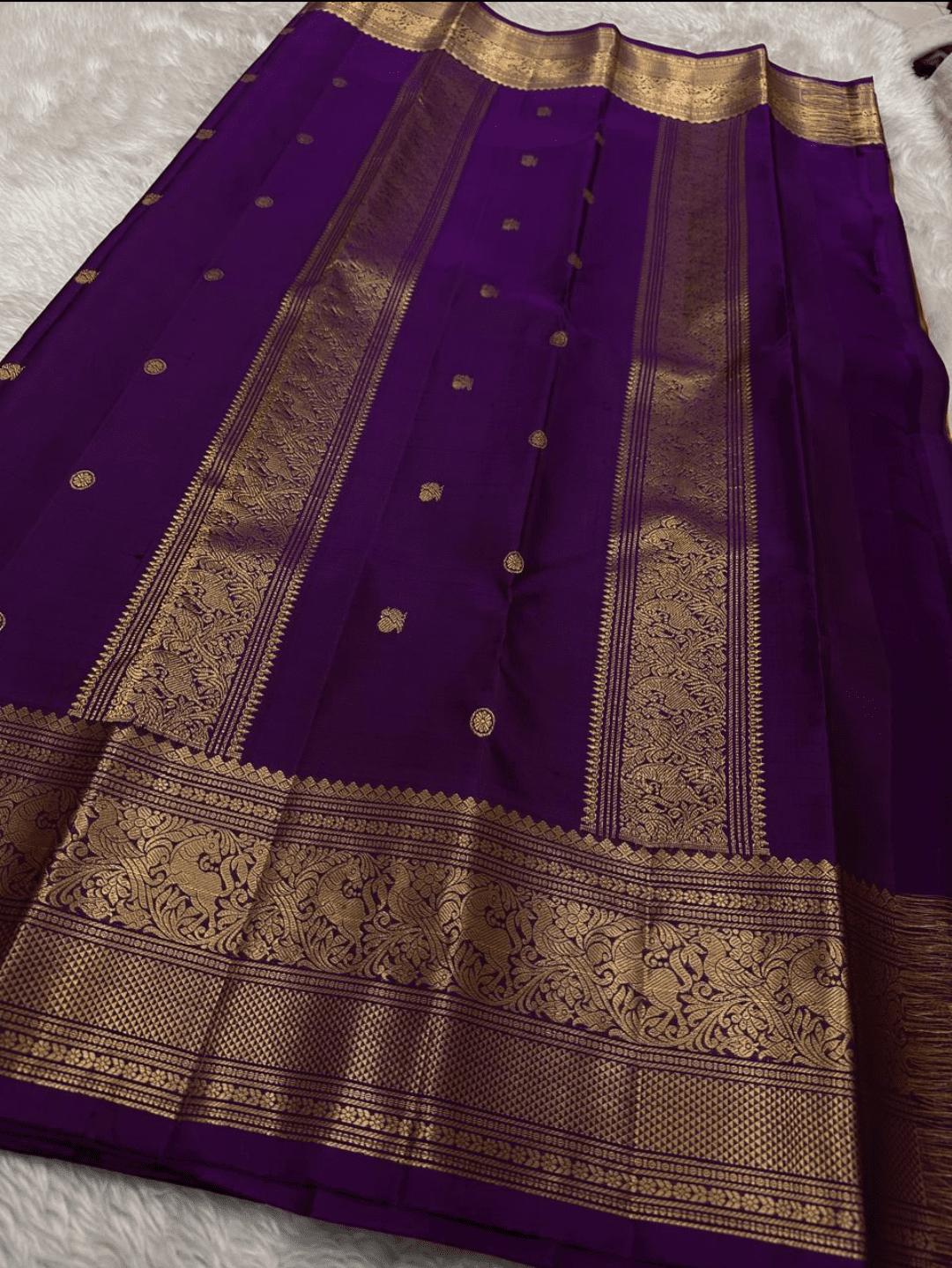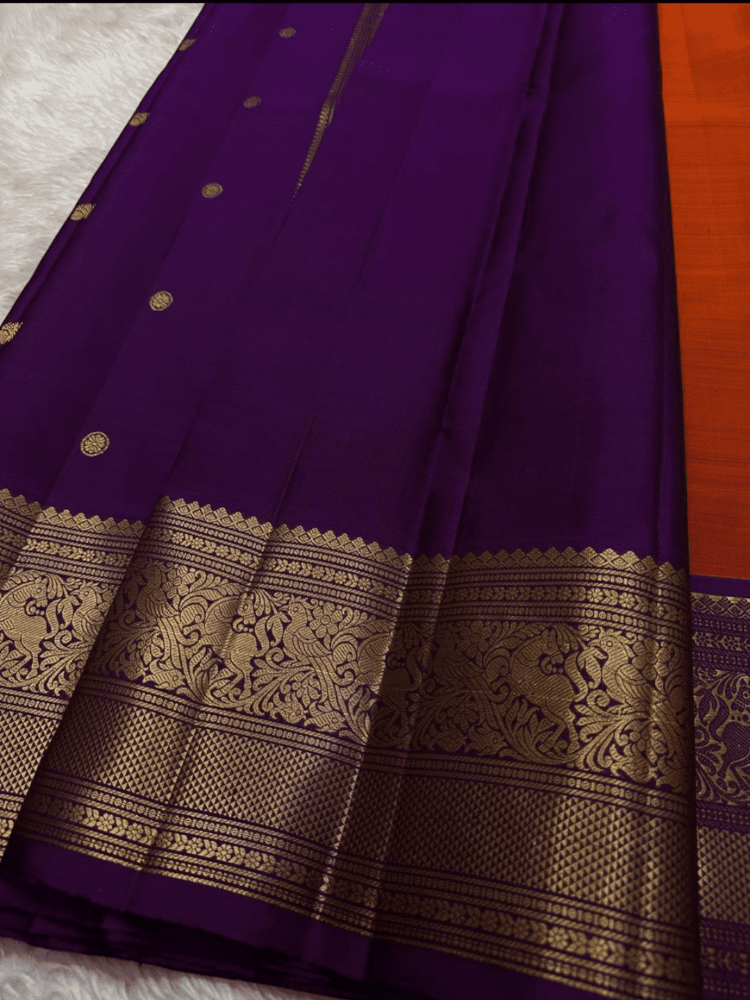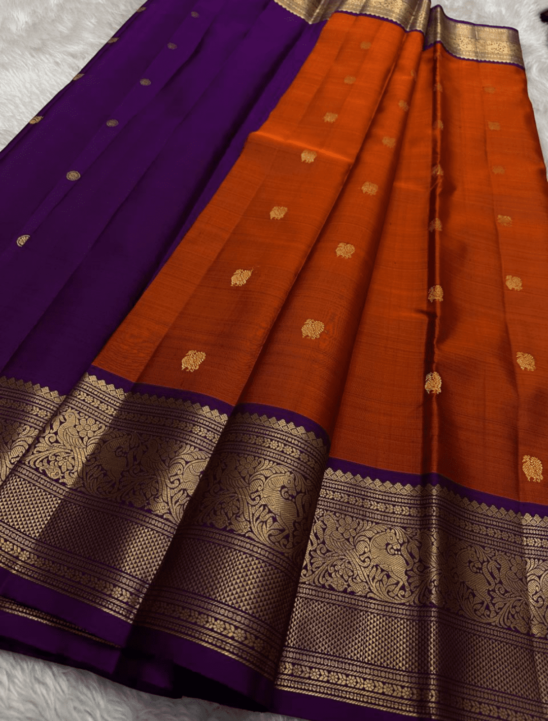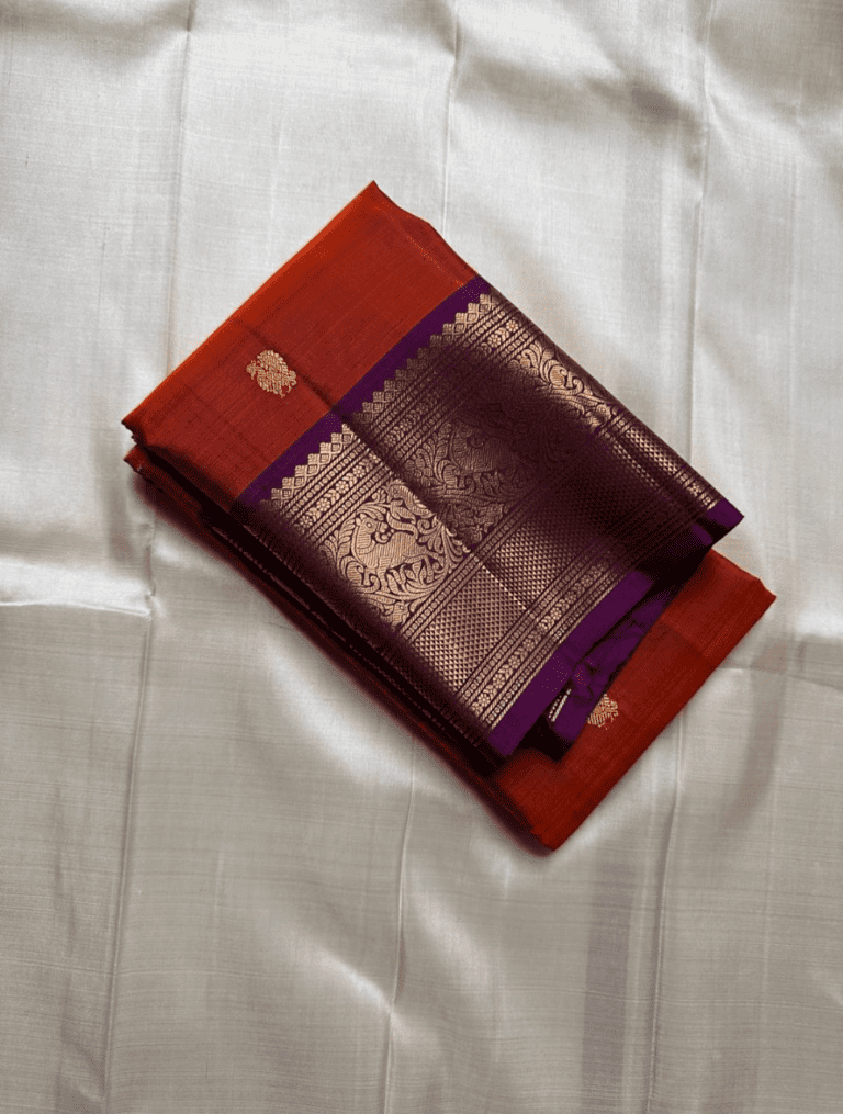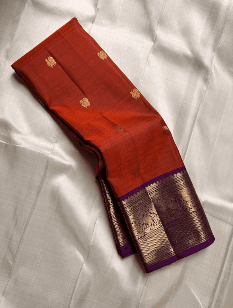 Vibhavari is a magnificent saree that embodies a powerful, regal presence with its bold and dramatic color combination. Its body, in a vibrant and warm shade of burnt orange, is subtly textured with a woven pattern and adorned with elegant golden buttas. This is perfectly framed by a stunning royal purple border and pallu, creating a truly majestic drape.